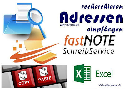 Wir, das ist das Team von fastNOTE SchreibService bietet ihnen Unterstützung bei der Vorbereitung auf ihr nächstes Mailing / ihre nächste Vertriebsaktion an. Seit nunmehr über 20 Jahren bieten wir Unternehmen im deutschsprachigen Raum manuelle Adressrecherche und Adresserfassung an.